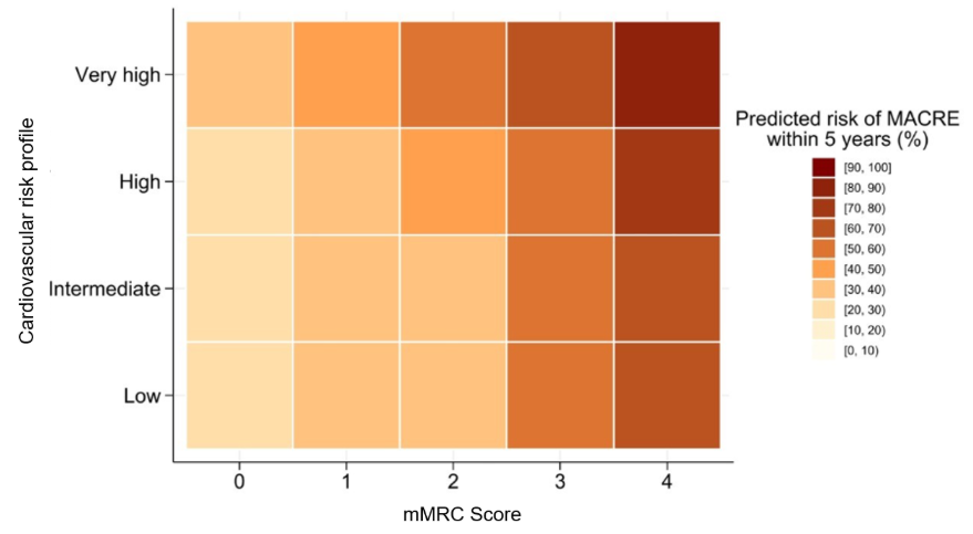 Figure 1: Risk classification heatmap, showing the predicted risks of MACRE in the overall study cohort at five years, stratified by cardiovascular risk profile and the modified Medical Research Council (mMRC) score. Numbers on the right represent the predicted risks in percentages.